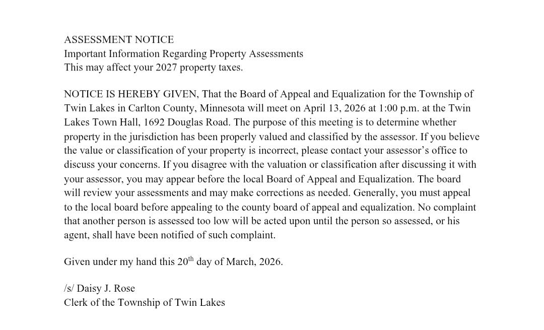 NOTICE IS HEREBY GIVEN, That the Board of Appeal and Equalization for the Township of Twin Lakes in Carlton County, Minnesota will meet on April 13, 2026 at 1:00 p.m. at the Twin Lakes Town Hall, 1692 Douglas Road. The purpose of this meeting is to determine whether property in the jurisdiction has been properly valued and classified by the assessor. If you believe the value or classification of your property is incorrect, please contact your assessor’s office to discuss your concerns. If you disagree with the valuation or classification after discussing it with your assessor, you may appear before the local Board of Appeal and Equalization. The board will review your assessments and may make corrections as needed. Generally, you must appeal to the local board before appealing to the county board of appeal and equalization. No complaint that another person is assessed too low will be acted upon until the person so assessed, or his agent, shall have been notified of such complaint.